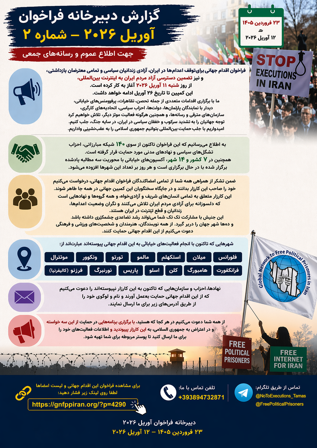 فراخوان اقدام جهانی برای توقف اعدامها در ایران، آزادی زندانیان سیاسی و تمامی معترضان بازداشتی، و نیز تضمین دسترسی آزاد مردم ایران به اینترنت بینالمللی، از روز شنبه ۱۱ آوریل ۲۰۲۶ آغاز به کار کرده است. این کمپین تا تاریخ ۲۶ آوریل ادامه خواهد داشت. ما با برگزاری اقدامات متعددی از جمله تحصن، تظاهرات، پرفورمنسهای خیابانی، دیدار با نمایندگان پارلمانها، دولتها، احزاب سیاسی، اتحادیههای کارگری، سازمانهای مترقی و رسانهها، و همچنین هرگونه فعالیت مؤثر دیگر، تلاش خواهیم کرد توجه جهانیان را به تشدید سرکوب و خفقان سیاسی در ایران، در سایه جنگ، جلب کنیم. امیدواریم با جلب حمایت بینالمللی بتوانیم جمهوری اسلامی را به عقبنشینی واداریم.
